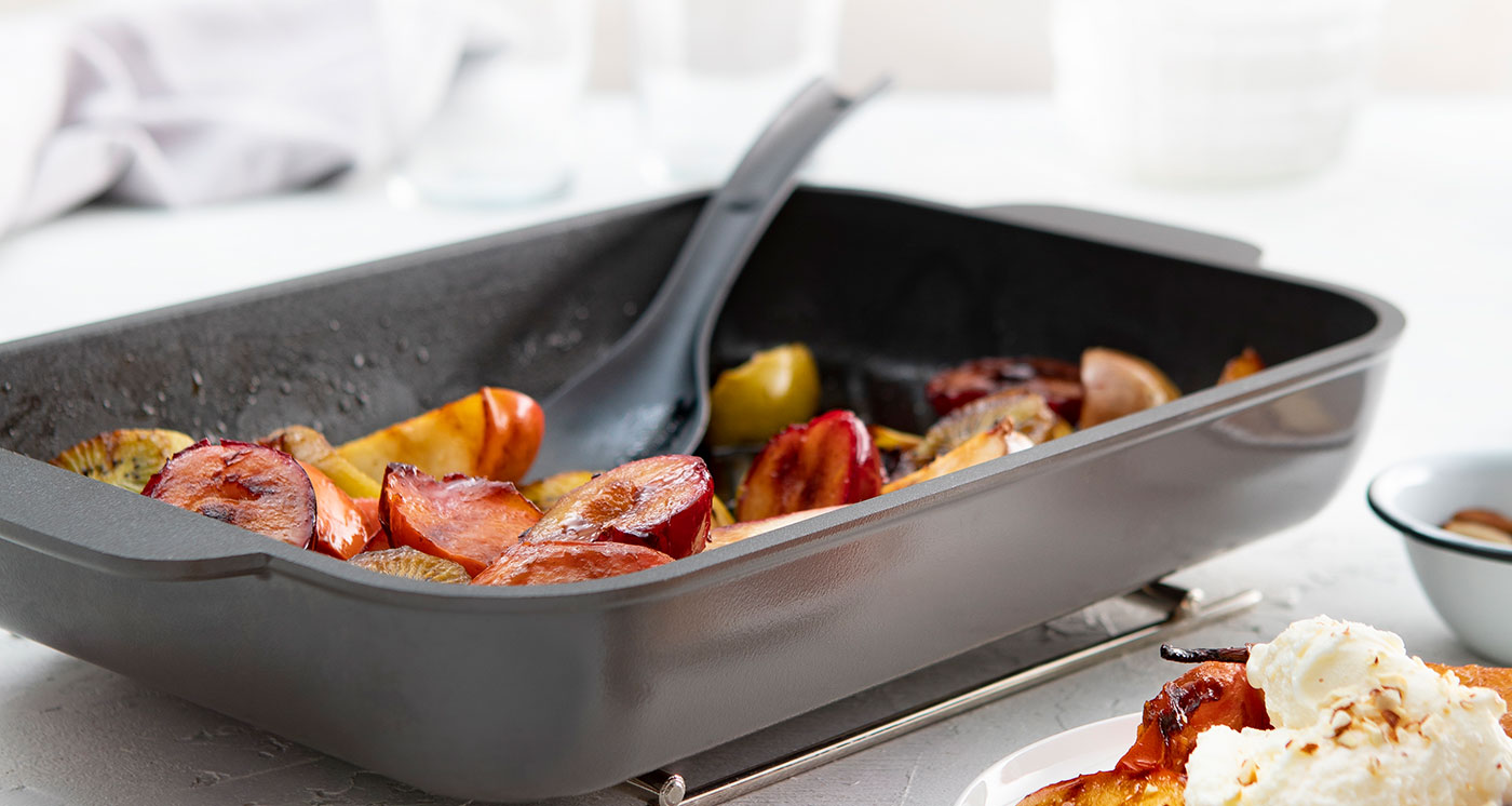¡Exclusivo diseño! Optimiza la distribución del calor logrando una cocción pareja y un sellado crocante. Esta bífera ha sido pensada para realizar cocciones para 4 comensales. Está recubierta por antiadherente lo que facilita su limpieza y sus paredes laterales son más altas lo que minimiza el salpicado. Su uso ideal es para la cocción de carnes, grillado de verduras, arrollados de queso, hamburguesas, brochetes, carnes blancas, etc. Es una pieza fundamental en la cocina de todos los días y se complementa perfectamente con la sartén con mango de 24 cm y la cacerola con asas 24 cm